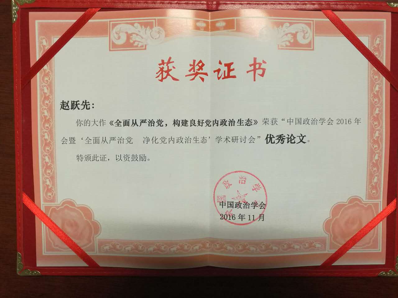 本次年会为期2天,政治学界知名专家高建、包心鉴、张献生、杨海蛟、王浦劬、桑玉成、张桂琳、周光辉、房宁、周平,以及来自中国社科院、北京大学、复旦大学、浙江大学等中国政治学研究领域的专家学者近400余人出席会议。PP电子教师赵跃先、胡志远和政法学院赵笑蕾老师参加了本次年会。本次会议共收到论文143篇,最终评出“优秀论文”11篇,PP电子教师赵跃先教授撰写的论文《全面从严治党,构建良好党内政治生态》获“优秀论文”奖。