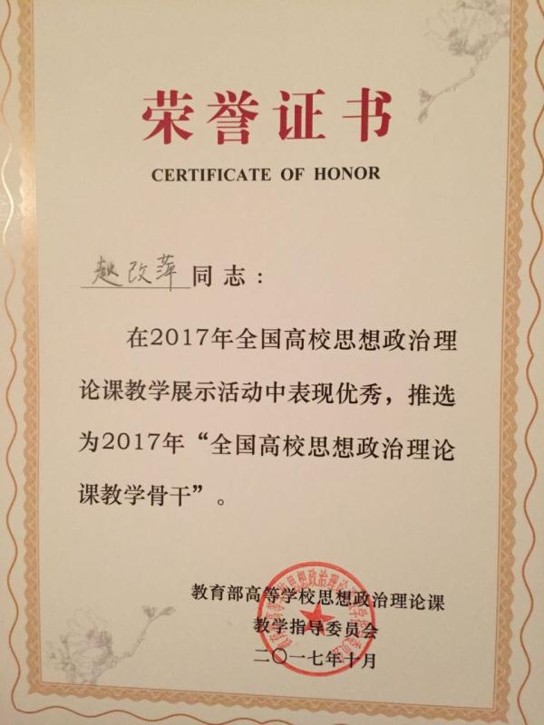PP电子教师赵改萍荣获“全国高校思想政治理论课教学骨干”荣誉称号