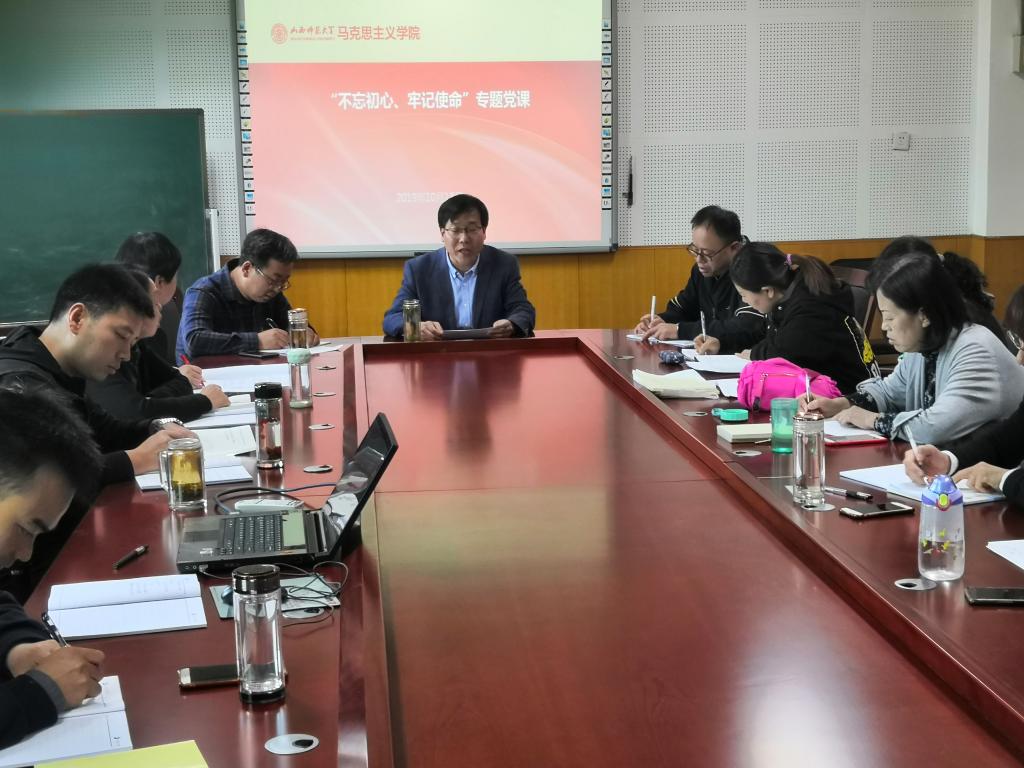 根据学校和学院“不忘初心、牢记使命”主题教育工作安排,10月18日下午,PP电子游戏网站在科学会堂A508室举办了“不忘初心、牢记使命”主题教育专题党课。专题党课由院党委书记王银、院长贾绘泽分别主讲,全院教师和学生党员一同参加。
