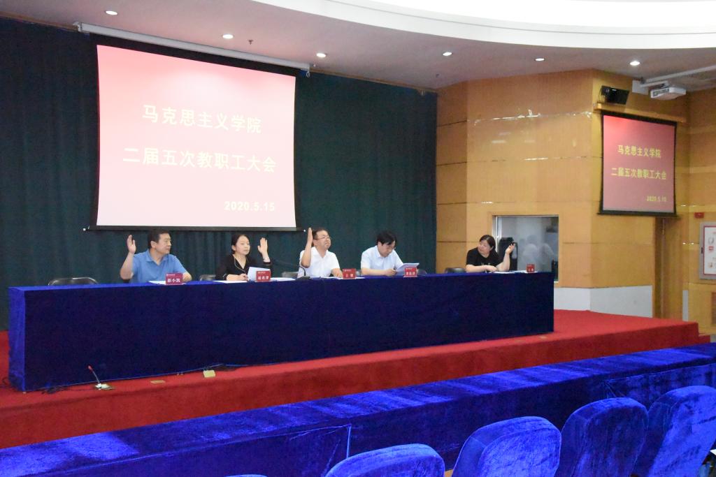 5月15日下午,PP电子游戏网站二届五次教职工大会在科学会堂二层报告厅召开,学院全体教职工参加大会,院党委副书记孙学虎、副院长赵改萍分别主持开幕式和闭幕式。正值疫情的特殊时期,学院精心组织,认真安排,每个教职工都佩戴了口罩,会议期间大家间隔而坐。