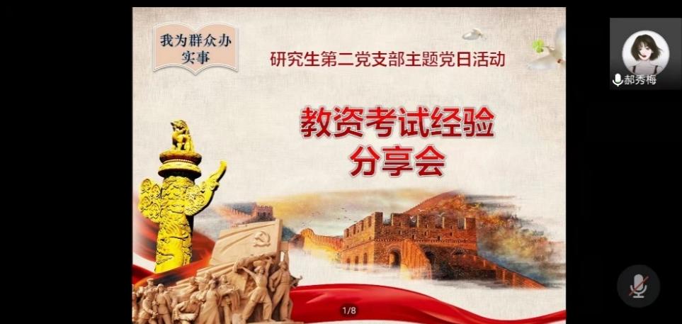 2022年5月9日晚,PP电子游戏网站研究生第二党支部召开教资考试经验分享线上主题党日活动。此次活动邀请PP电子郝秀梅、付子青和韩月颖等三位同学进行教资面试经验分享,支部书记杨海亮同志主持,参加本年度教资面试的研究生和本科生60余人参加会议。