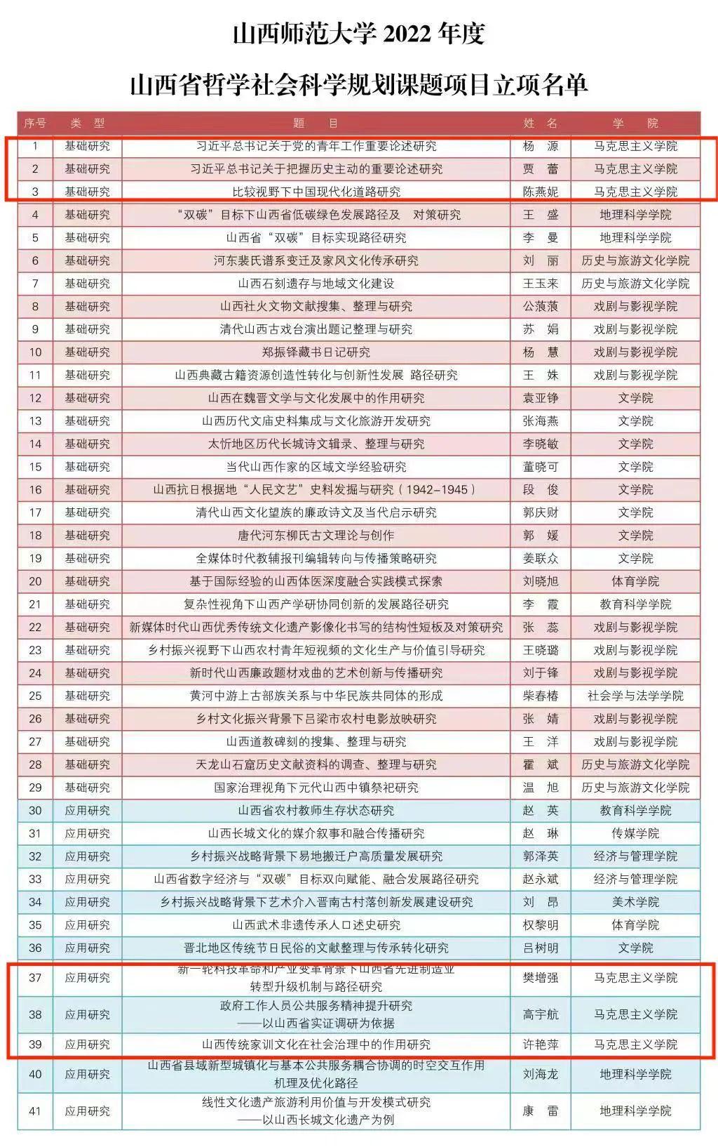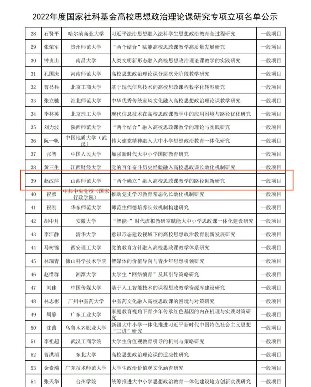 近日,2022年度国家社科基金高校思想政治理论课研究专项立项名单和山西省哲学社会科学规划课题项目评审结果公布。PP电子赵改萍副院长的《“两个确立”融入高校思政课教学的路径创新研究》获批国社科高校思政课研究专项一般项目,杨源、贾蕾、陈燕妮、樊增强、高宇航、许艳萍六位老师获批省哲社规划课题基础研究和应用研究项目。