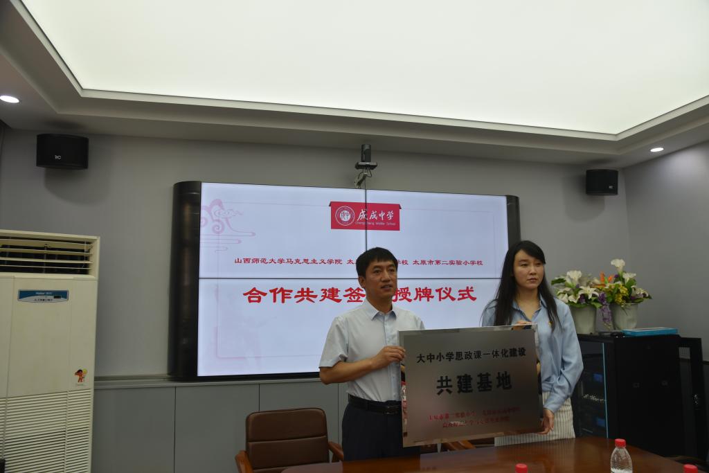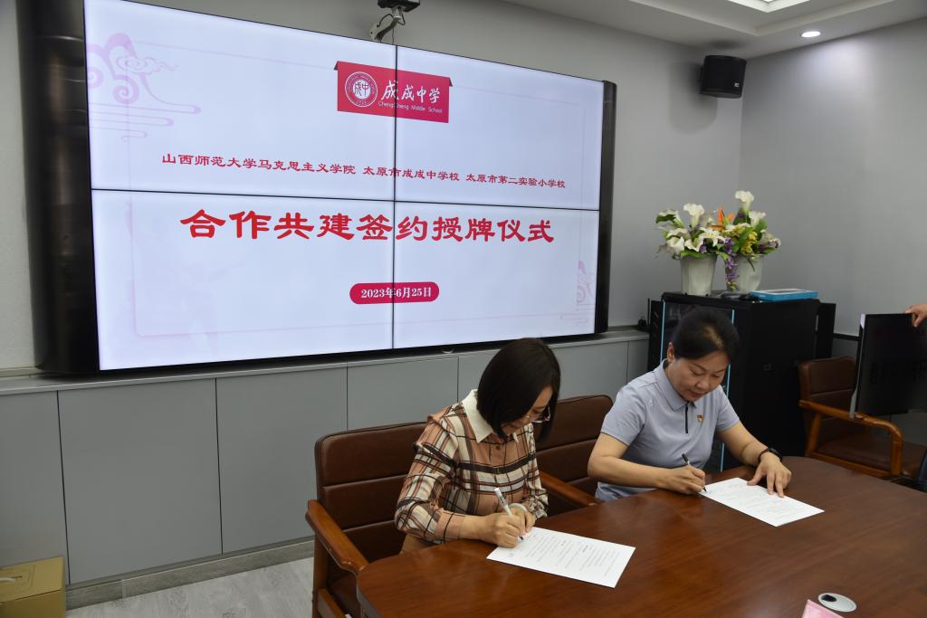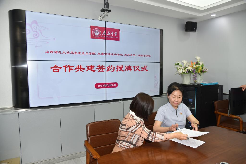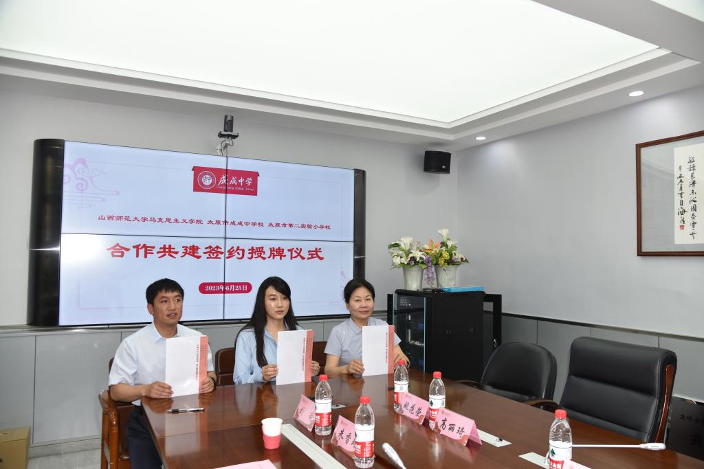 2023年6月25日上午,PP电子游戏网站与太原市成成中学校、太原市第二实验小学大中小学思政课一体化建设共建基地、教育实习与研究基地和志愿服务基地签约授牌仪式在太原市成成中学校迎泽校区隆重举行。