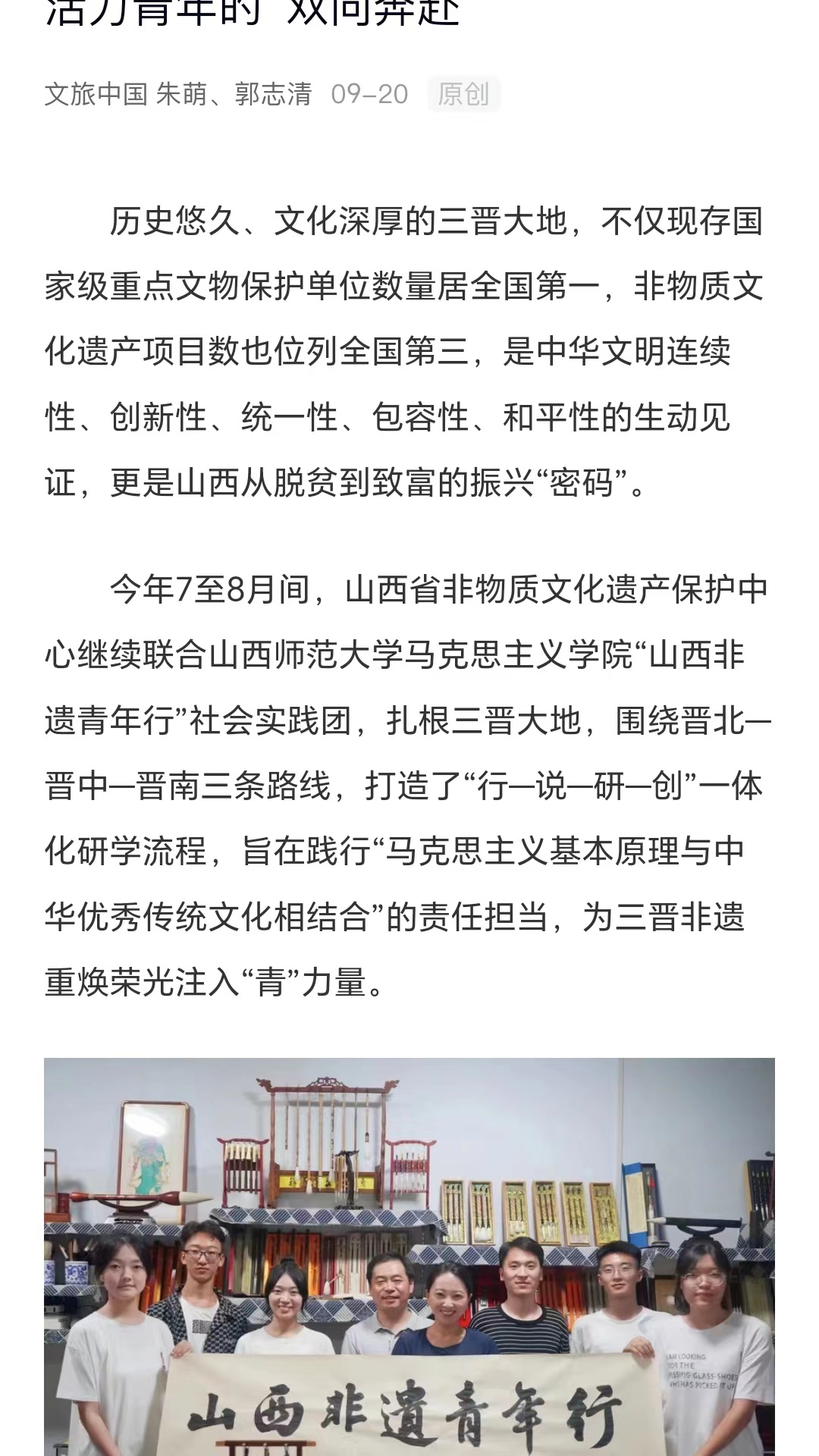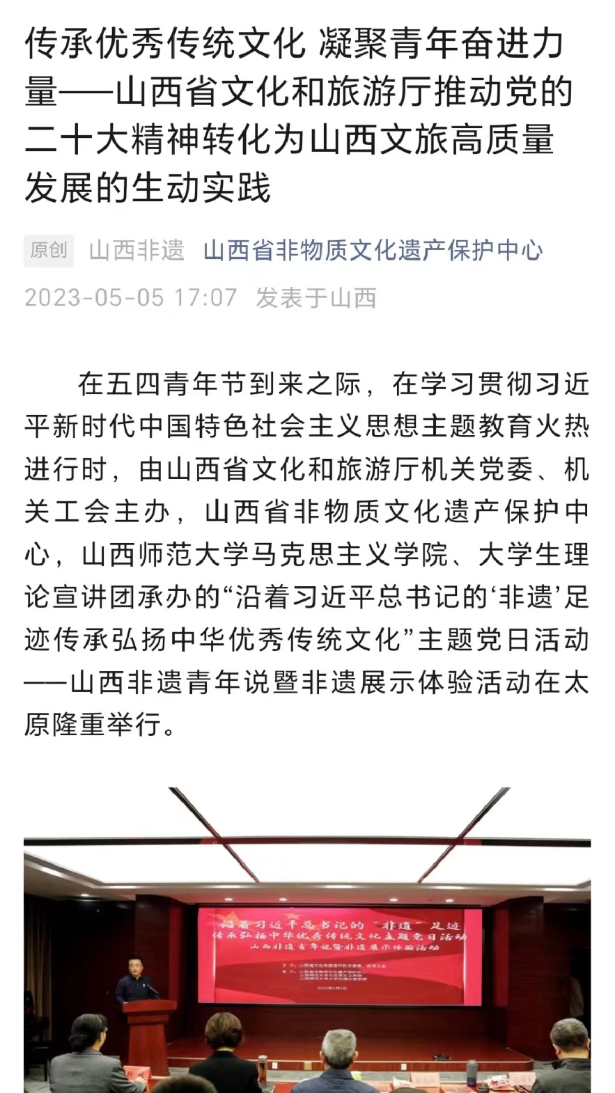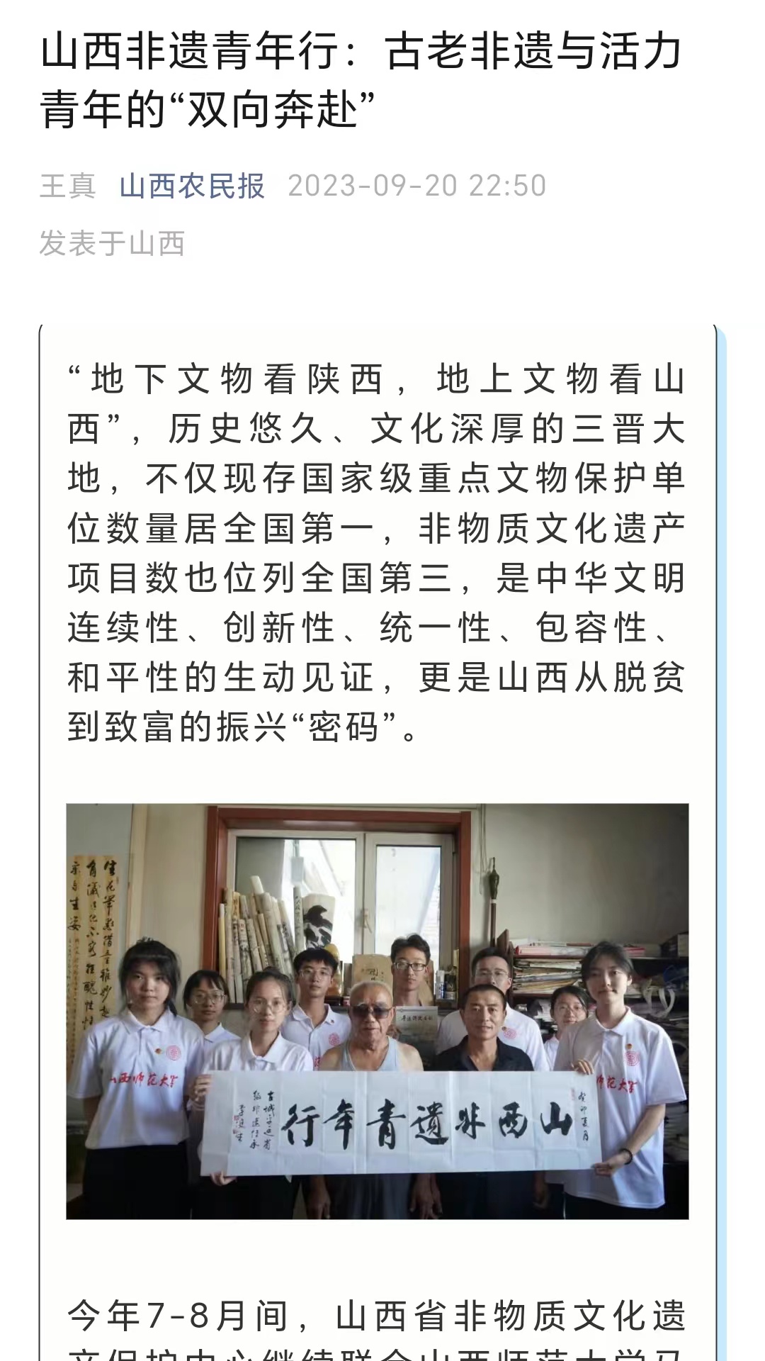 党的十八大以来,习近平总书记曾多次到山西考察调研,对文化传承作出重要指示、寄予殷切期望。为贯彻落实习近平总书记视察山西重要讲话精神,引导青年学生增强文化传承与创新的信心和决心,两年来,PP电子游戏网站“山西非遗青年行”社会实践团队聚焦山西非遗,在山西省非物质文化遗产保护中心的大力支持下,开展了“山西非遗青年行+山西非遗青年说+山西非遗青年创+山西非遗青年研”系列活动,打造了“行—说—创—研”一体化研学流程,获得人民论坛网、人民日报视频客户端、人民网、中国青年报、文旅中国、山西省文旅厅、河南省文旅厅、山西日报山西青年报、山西农民报、中国大学生在线、高校辅导员工作室等多家权威机构和媒体的广泛报道。