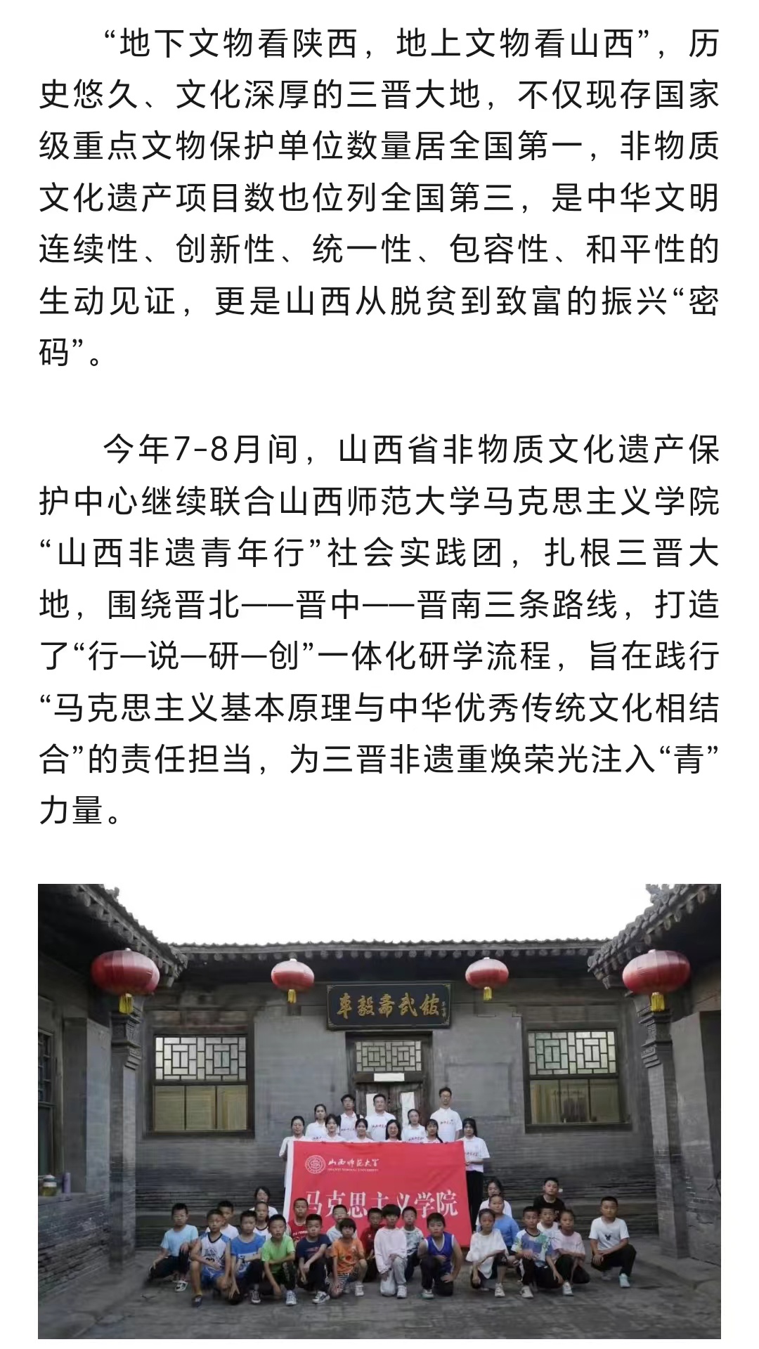 在践行“两个相结合”的深入推进下,PP电子200余名“山西非遗青年行”团队队员沿着习近平总书记考察山西的重要足迹,循着三晋大地历史文化脉络,通过“线上+线下”共研共学的方式,深入省内10余个县市,走访了非遗项目50余处,全方位感受了山西非遗文化的独特魅力,领略非遗传承人在平凡中创造不凡、追求卓越、精益求精的“工匠精神”。团队成员们用脚步丈量三晋大地,用文字诠释非遗魅力,用行动传承非遗精神,践行“马克思主义基本原理与中华优秀传统文化相结合”的责任担当,为三晋非遗重焕荣光注入“青”力量。