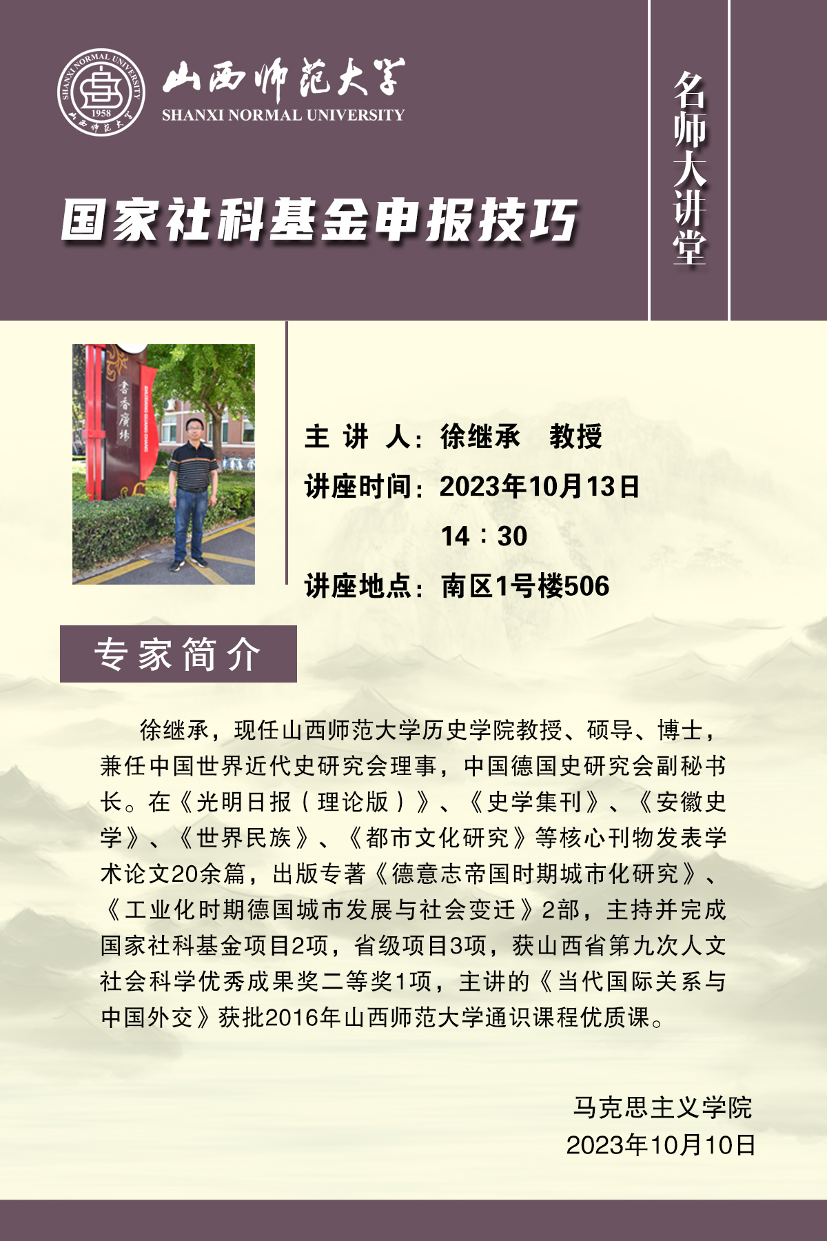 10月13日下午,PP电子游戏网站邀请PP电子历史与旅游文化学院徐继承教授在1506会议室举办了《国家社科基金申报心得与体会》的专项座谈交流。徐继承教授结合自身三次成功申报国家社科基金项目的实际,从准确定位基金类型、精准把握选题、强化推进论证等三个方面,与参会教师分享了他的成功经验与心得体会。