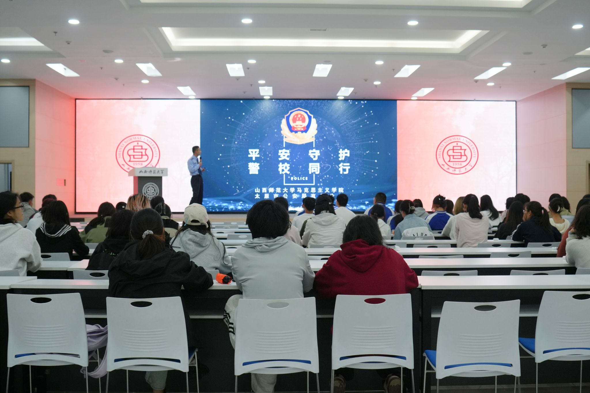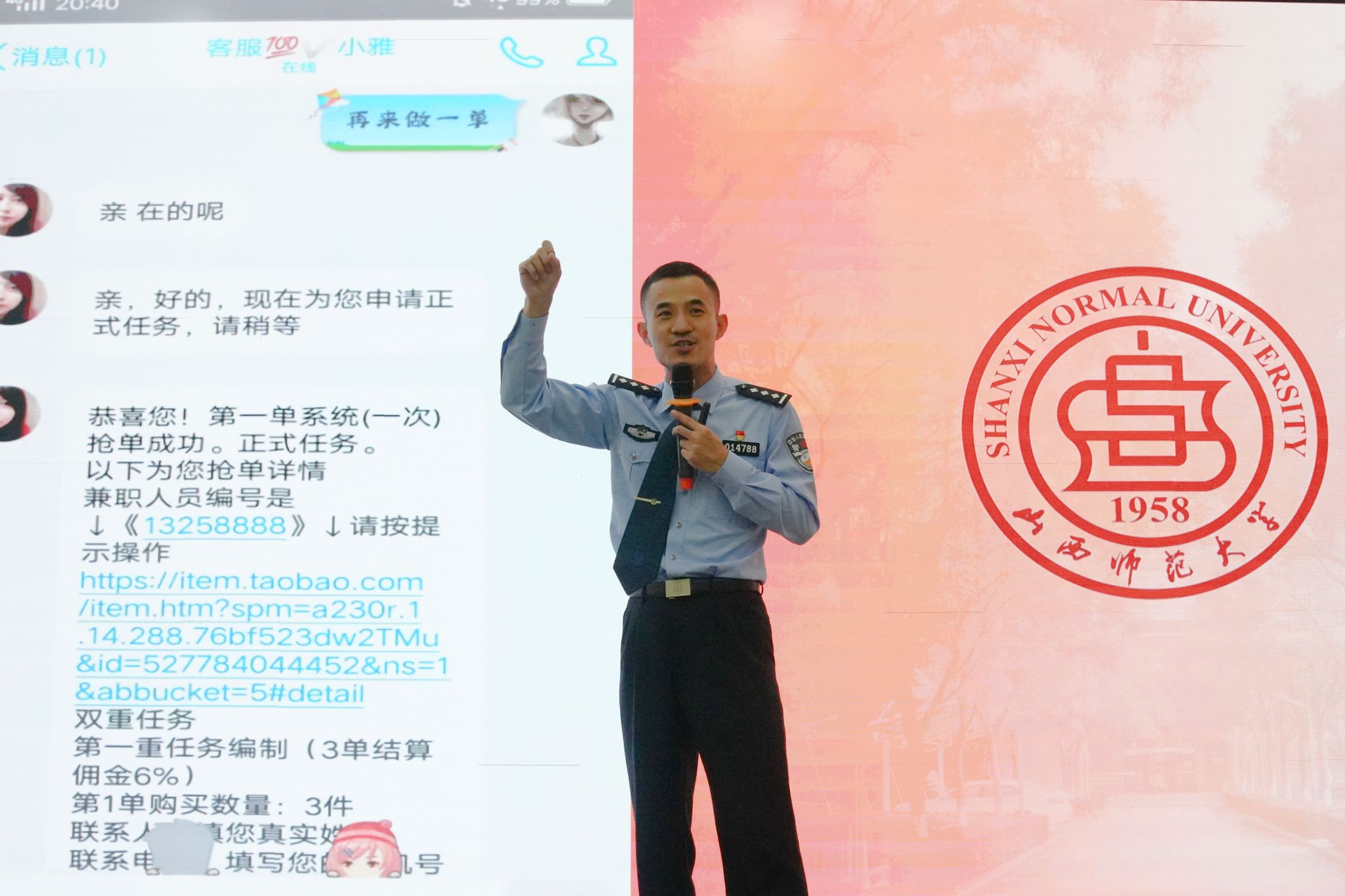 为切实增强师生对电信网络诈骗的防范意识,5月23日,PP电子与初心社区在北区2号教学楼毓秀学堂共同举办了“平安守护,警校同行”防范电信诈骗专题讲座。本次讲座特邀太原市公安局直属分局的王警官担任主讲,2024级学生代表参加。