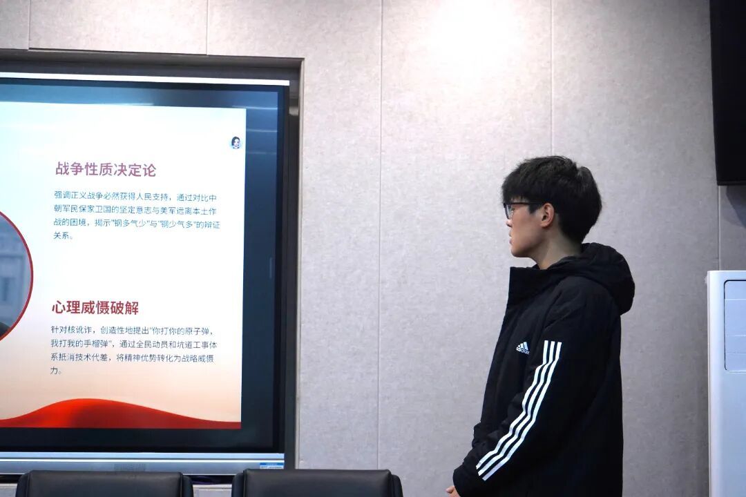 王永博同学聚焦志愿军战法创新,通过典型战例分析运动战、夜战、阵地战相结合的灵活战术,阐释了毛泽东军事思想在实战中的运用,探讨了其对现代智能化战争的意义。