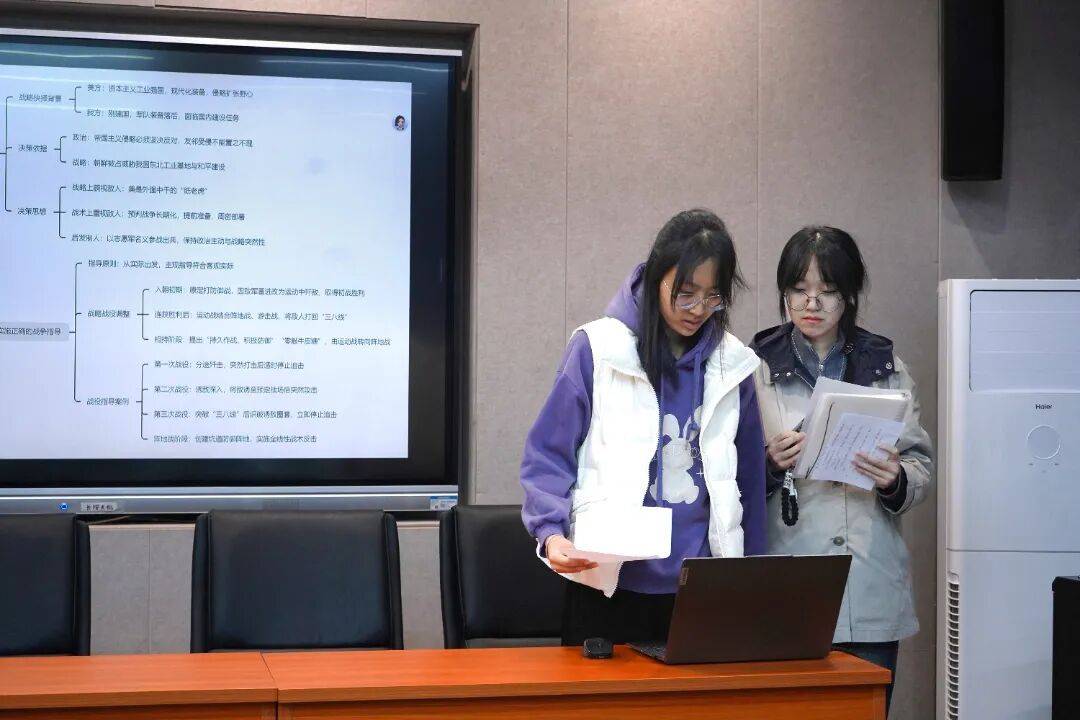 闫莎舒、张靖怡同学围绕抗美援朝战争“敢于斗争,后发制人”与“善于斗争,从实际出发”两个核心经验,分析了党展现出的战略远见与战争智慧,对当代青年成长与国防现代化建设的现实启示。