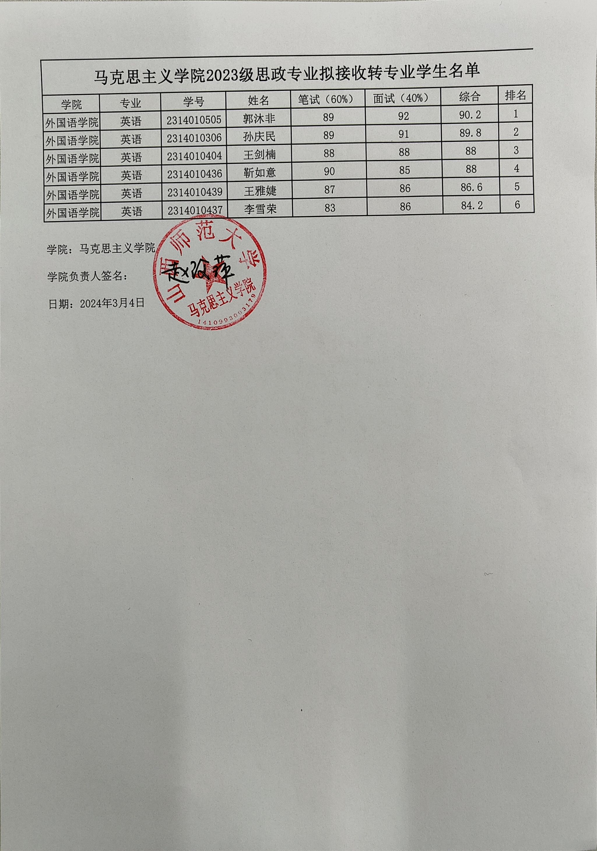 PP电子游戏网站2023级思政专业拟接收转专业学生名单