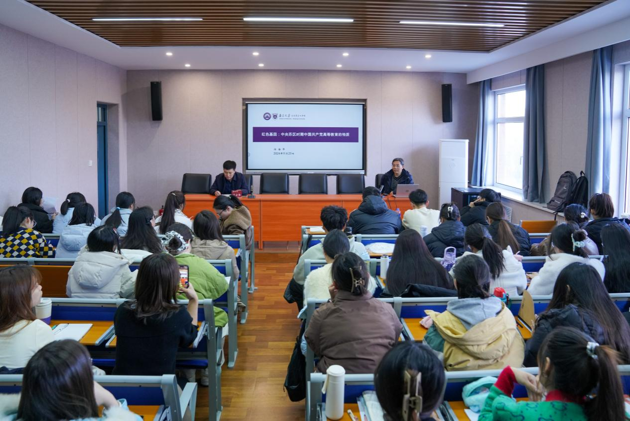 由吉志强副院长就游海华教授的基本情况作了介绍。游海华教授以《红色基因:中央苏区时期中国共产党高等教育的特质》为题,从研究缘起、研究背景、研究内容三个方面展开报告。