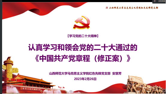 会议第二项,支部副书记安慧芳专题领学党的二十大通过的《中国共产党章程(修正案)》。以“认真学习和领会党的二十大通过的《中国共产党章程(修正案)》”为题,从党的二十大党章修改的背景意义、主要内容及学好党章和党章修改的重要精神三个方面进行详细解读,并将党的二十大报告中的新观点、新理念、新论断贯穿其中,引导大家增强党性修养,做新时代共产党人的楷模和先锋战士。