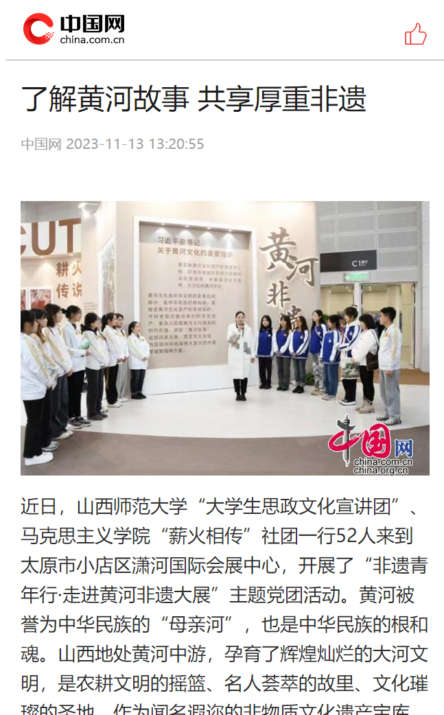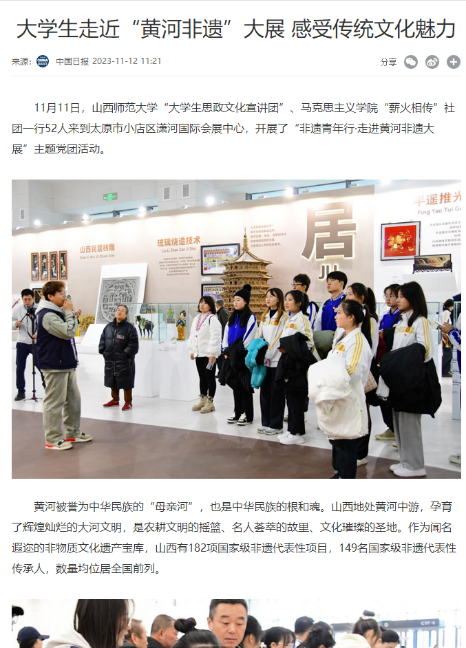 为贯彻落实习近平总书记考察山西重要指示精神,引导青年积极投身于文化传承与创新的实践中去,为非遗的保护与传承注入新活力,11月11日上午,PP电子团委联合PP电子游戏网站“薪火相传”党支部开展了“以文化人 凝心铸魂——非遗青年行·走进黄河非遗大展”主题党团活动,PP电子团委学生会各部门学生代表、本科生“薪火相传”党支部师生代表、青马骨干培训班学生代表以及大学生理论宣讲团学生代表共同参加。