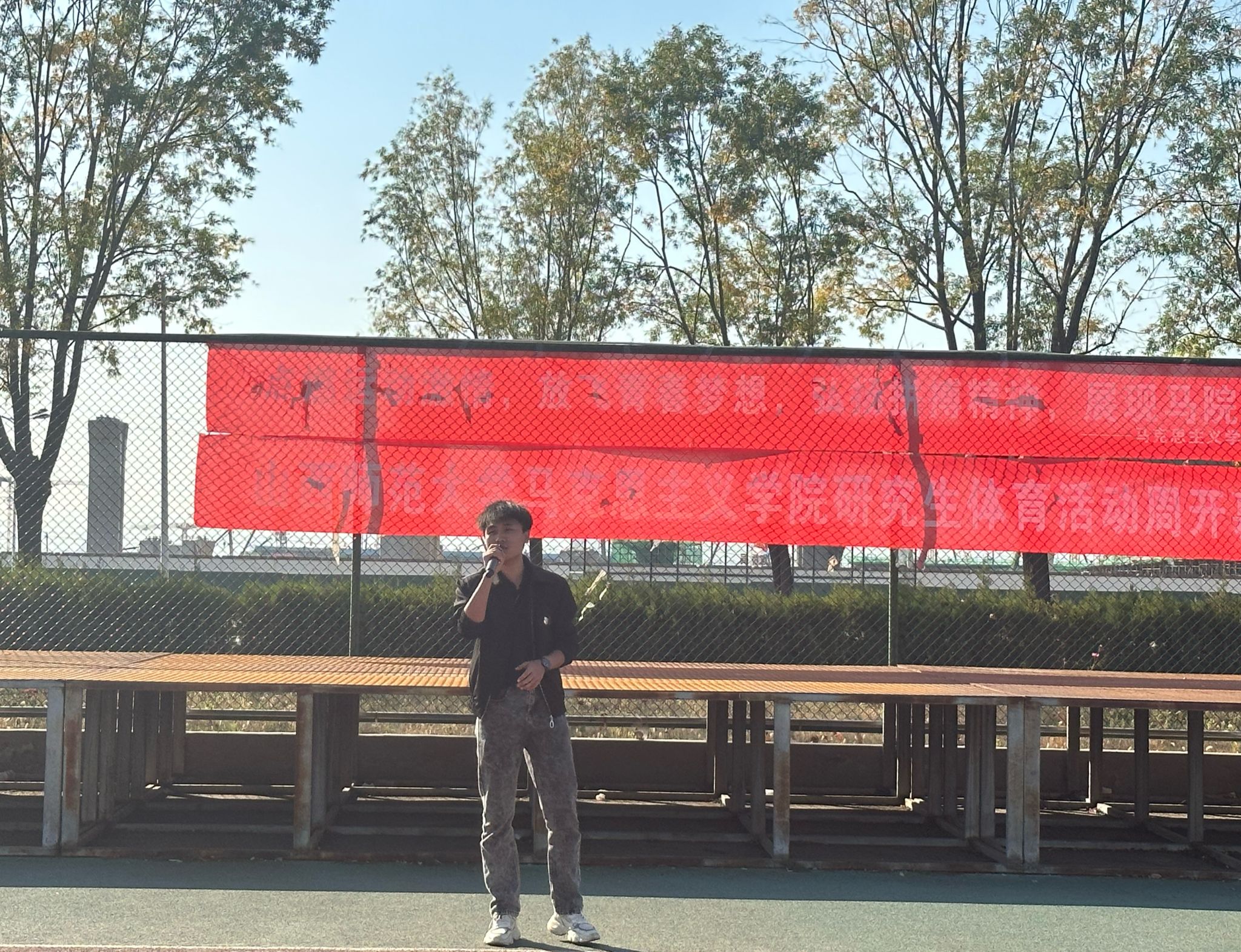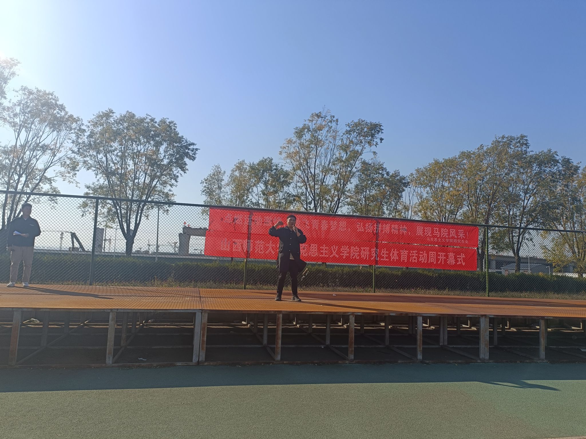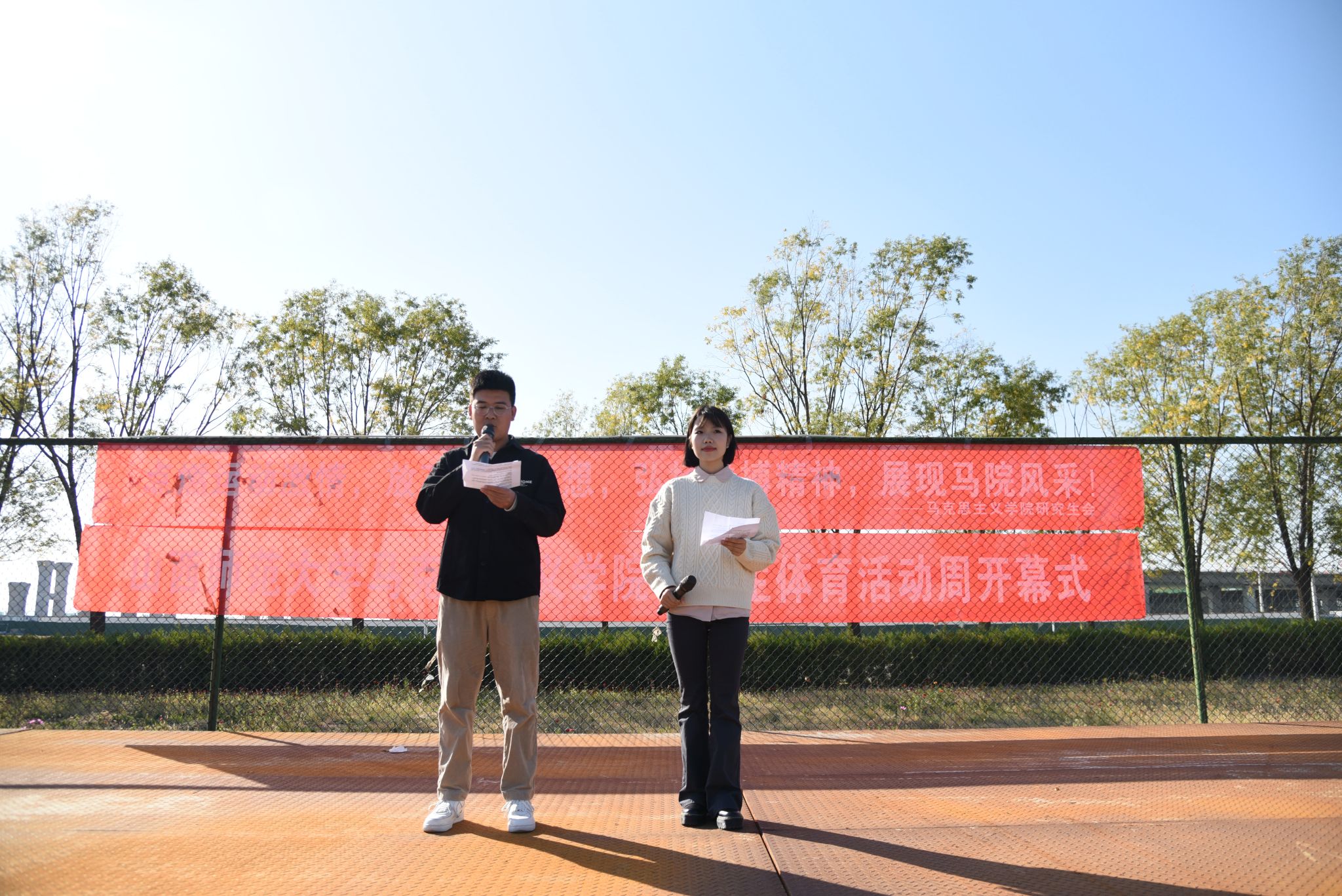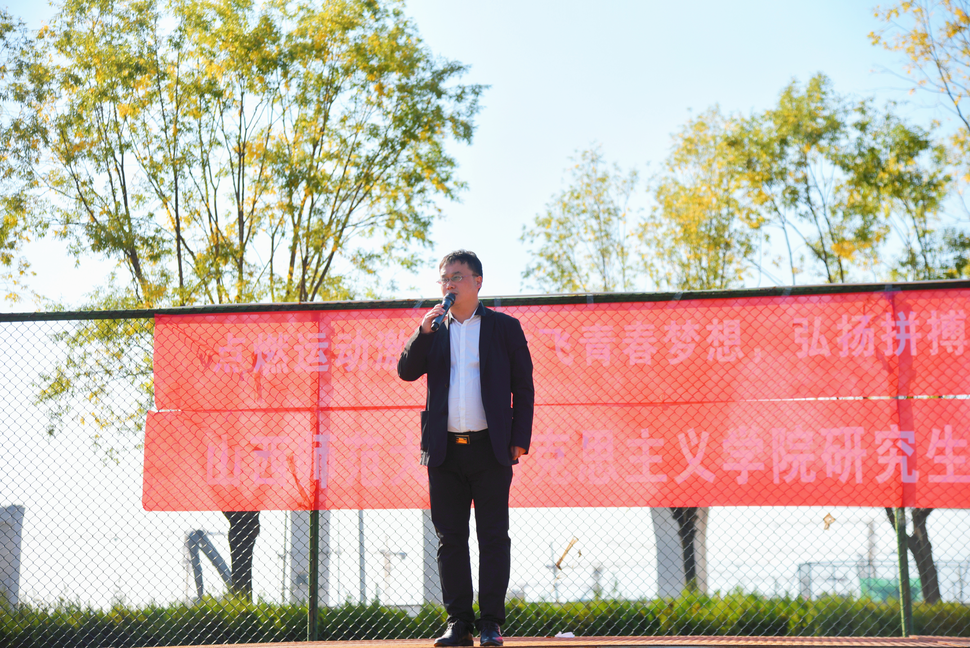 接下来,院研究生会文体部部长白凯辉介绍本次体育活动周的项目安排。活动周共有拔河、网球准投、羽毛球比赛、背夹球往返接力、趣味跳长绳、篮球比赛、传输带竞走、搬运球接力、五十米接力比赛、往返接力跳绳和动力火车共十一个项目。