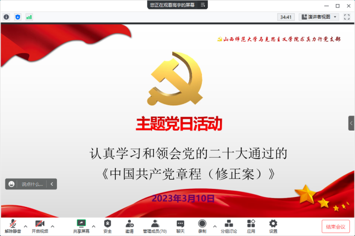 组织委员高宇同志以“认真学习和领会党的二十大通过的《中国共产党章程(修正案)》”为题,从深刻认识党章的重要地位和作用谈起,详细解读了二十大党章修改的主要内容,要求党员同志要准确把握学习贯彻新党章的实践要求,深入领会党的二十大党章修改的重大意义,更加自觉地学习党章、遵守党章,切实贯彻党章、坚决维护党章。